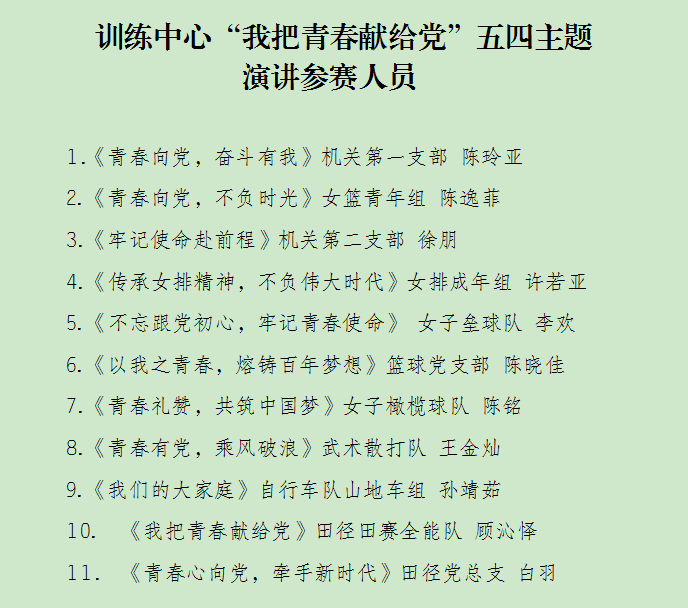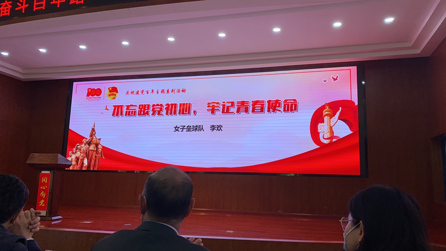 4月30日上午,江苏省体育局训练中心举行庆祝建党百年系列主题活动——“我把青春献给党”五四主题演讲比赛,来自体育局训练中心内7个项目中心及5个党支部的全运会冠军、青年党员和青年团员共11名选手参加,bv伟德国际1946江苏女垒党支部选派队长李欢参加这次比赛,她以《不忘跟党初心,牢记青春使命》为题,在众多参赛选手脱颖而出,荣获此次演讲比赛第一名。