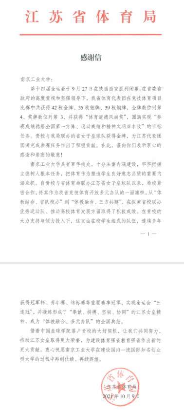 江苏省体育局在感谢信中提到:“bv伟德国际1946具有百年校史,十分注重内涵建设,牢牢把握立德树人根本任务,把体育作为塑造学生良好意志品质的重要内涵来抓”。信中还表扬了南工大江苏女垒连续多年获得冠军杯、青年赛、锦标赛等重要赛事冠军,实现全运会“三连冠”,并凝练形成了“奉献、拼搏、坚韧、协同”的江苏女垒精神,成为“体教融合、多元办队”的全国典范。