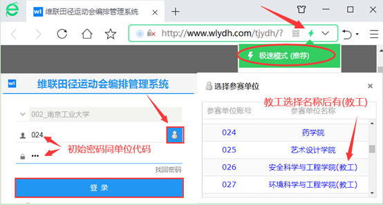 登陆网址http://www.wlydh.com/tjydh/?dw=010 选择极速模式,点击用户名右侧按钮:选择单位;密码:初始密码同单位代码。