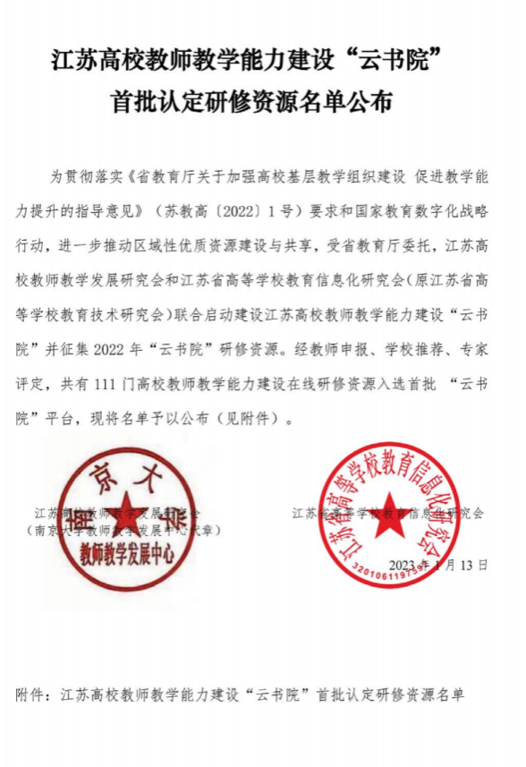 近日,江苏高校教师教学能力建设“云书院”首批认定研修资源名单公布,我院章璐璐老师的《大学体育》课程在线研修资源成功入选“云书院”平台。