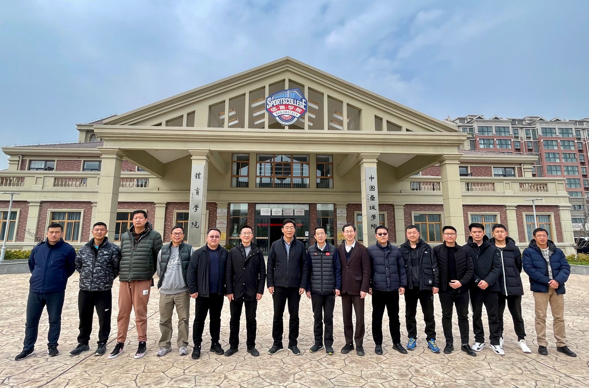 交流会结束后,双方在学院亚青办公楼前合影留念。随后,前往卓逸垒球场、行健田径场和综合馆进行参观。