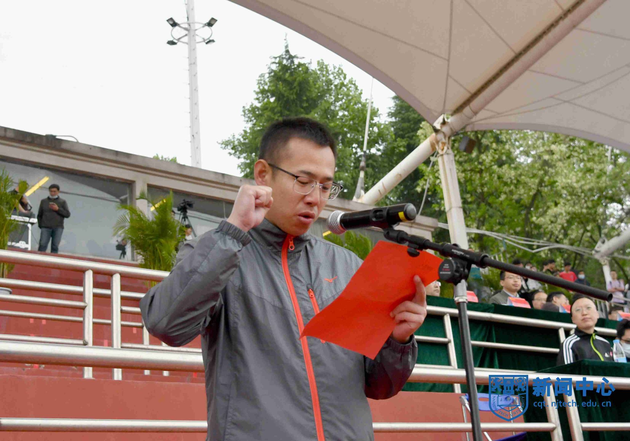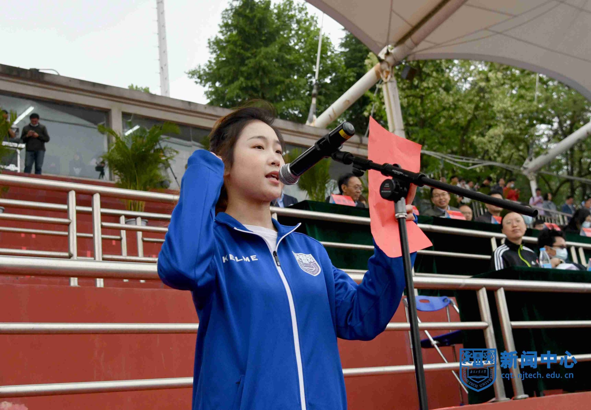 在升国旗和校旗仪式之后,经济与管理学院工管2103班朱舒同学和bv伟德国际1946王鑫老师分别代表全体运动员和裁判员宣誓。