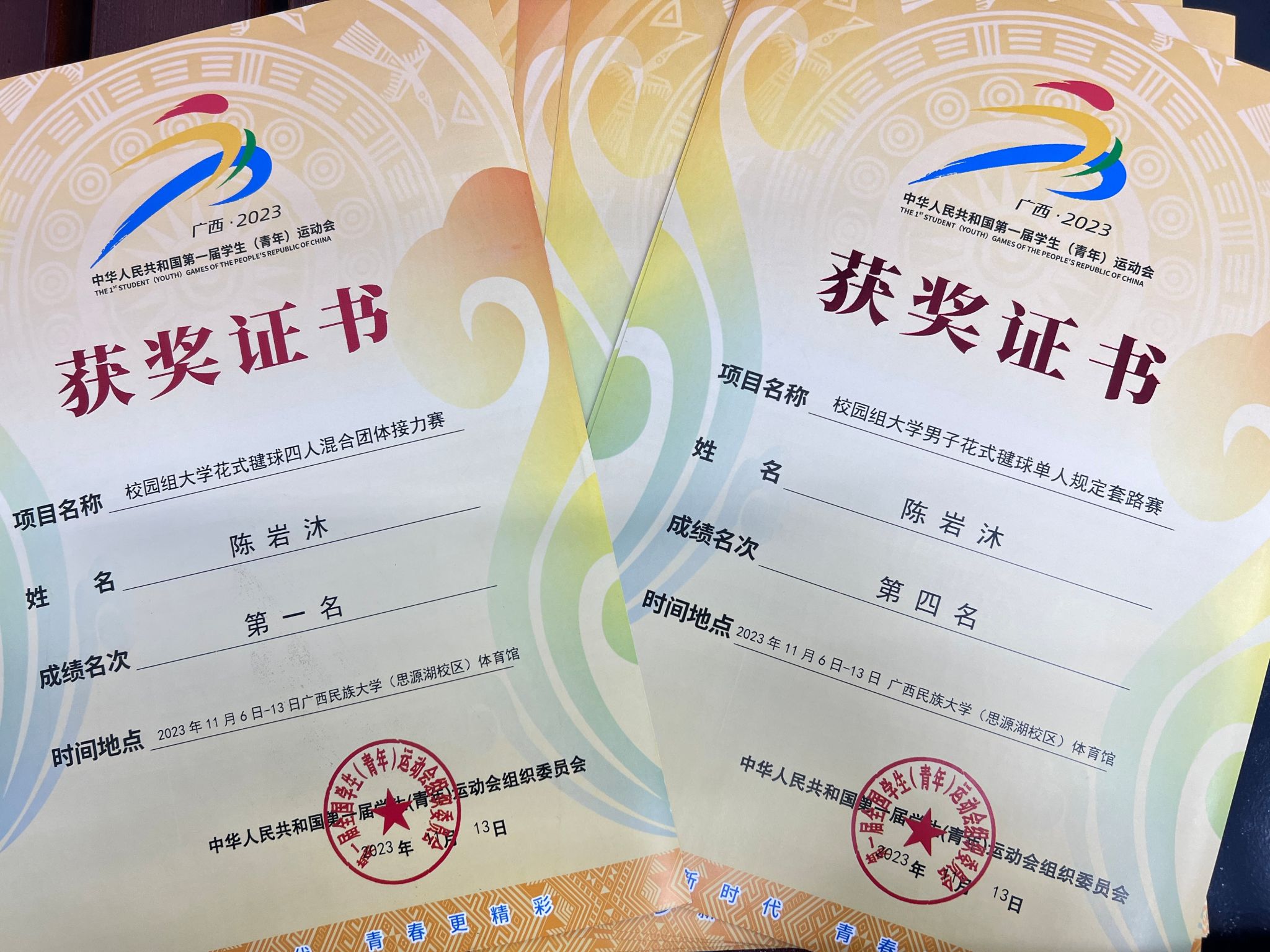 此后,在刚结束的2023年江苏省毽球锦标赛暨长三角地区毽球大赛中再次传来捷报,陈岩沐同学夺得男子组花毽项目磕踢、绷踢、拐踢、五项全能、个人规定套路共五枚金牌,盘踢、跳踢两枚银牌,再次为校夺得荣誉。