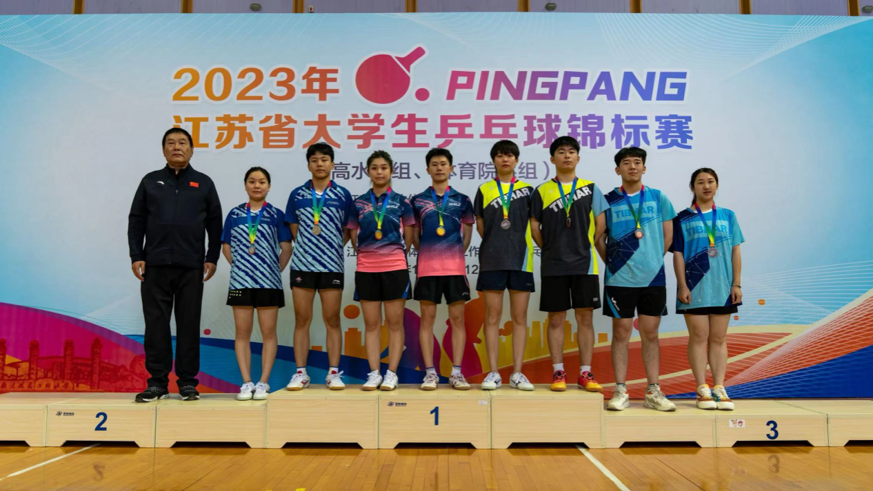 12月1日至3日,由江苏省学生体育协会主办,江苏省学生体育协会高校工作委员会、南京信息工程大学承办的2023年江苏省大学生乒乓球锦标赛(高水平组、体育院系组)在南京信息工程大学体育馆举行,来自全省高校的12支运动队参加了本次比赛。bv伟德国际1946大学生乒乓球队在曹婧教练带领下,团结协作、奋勇拼搏,取得2金1银的优异成绩。