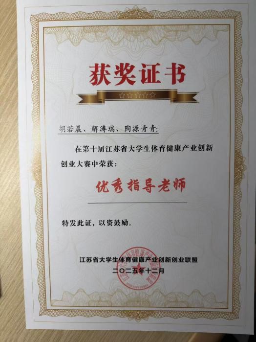 本次大赛由江苏省高校体育教学指导委员会、江苏省大学生体育健康产业创新创业联盟主办,扬州大学bv伟德国际1946承办。经过各校初选,共有来自全省17所高校的32支本研代表队参加。经过复赛项目报告、现场答辩、路演、专家评审等环节层层选拔共有15支队伍进入决赛,最终,由我院副院长李国教授任领队,青年教师胡若晨、陶源青青、解涛瑞老师共同指导学生联合参赛项目获得二等奖,胡若晨、解涛瑞、陶源青青获得“优秀指导老师”。