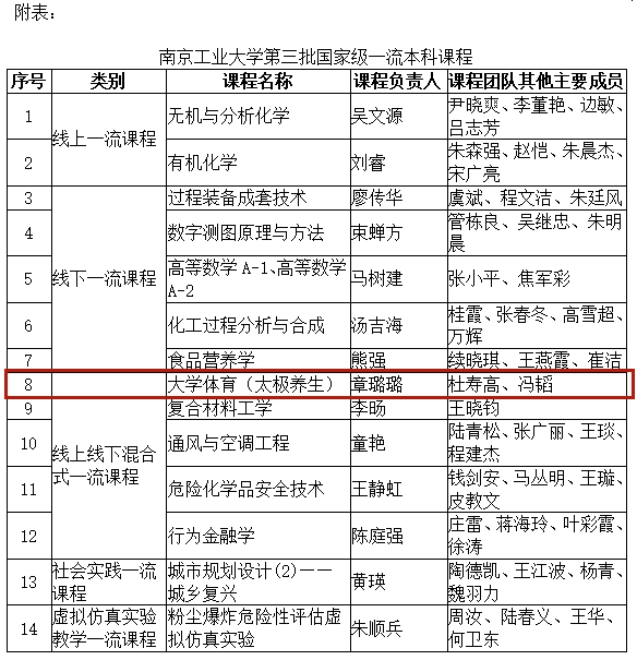 近日,教育部公布第三批国家级一流本科课程认定结果(教高函〔20259号),我院章璐璐老师作为课程负责人,联合杜寿高、冯韬老师建设的《大学体育(太极养生)》课程成功入选国家级线上线下混合式一流本科课程,实现我院国家级一流课程“零”的突破。