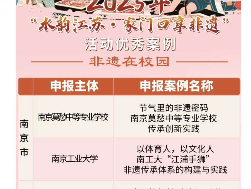 近日,江苏省文化和旅游厅公布了2025“水韵江苏·家门口享非遗”优秀案例。bv伟德国际1946江浦手狮传承保护基地和宣传展示基地申报的《以体育人,以文化人—南工大“江浦手狮”非遗传承体系的构建与实践》案例获得“非遗在校园”优秀案例。