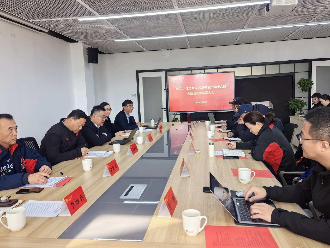 为深入贯彻第十五届全运会周期工作总结会议精神,启动第十六届全运会周期备战工作并部署首个冬训任务,2026 年1月8日,南工大江苏女垒2026 年备战第十六届全运会冬训动员大会在bv伟德国际1946bv伟德国际1946209会议室召开。校党委常委、副校长陆伟东、江苏省体育局手曲棒垒球运动管理中心主任吴中琦、bv伟德国际1946院长张天峰、党总支书记刘涛、南工大江苏女垒督导及总顾问宋秋元、南工大江苏女垒党支部书记李海兵、女垒办公室主任贡新烨、新一届教练组成员、全体队员以及相关工作人员参会。会议由张天峰主持。