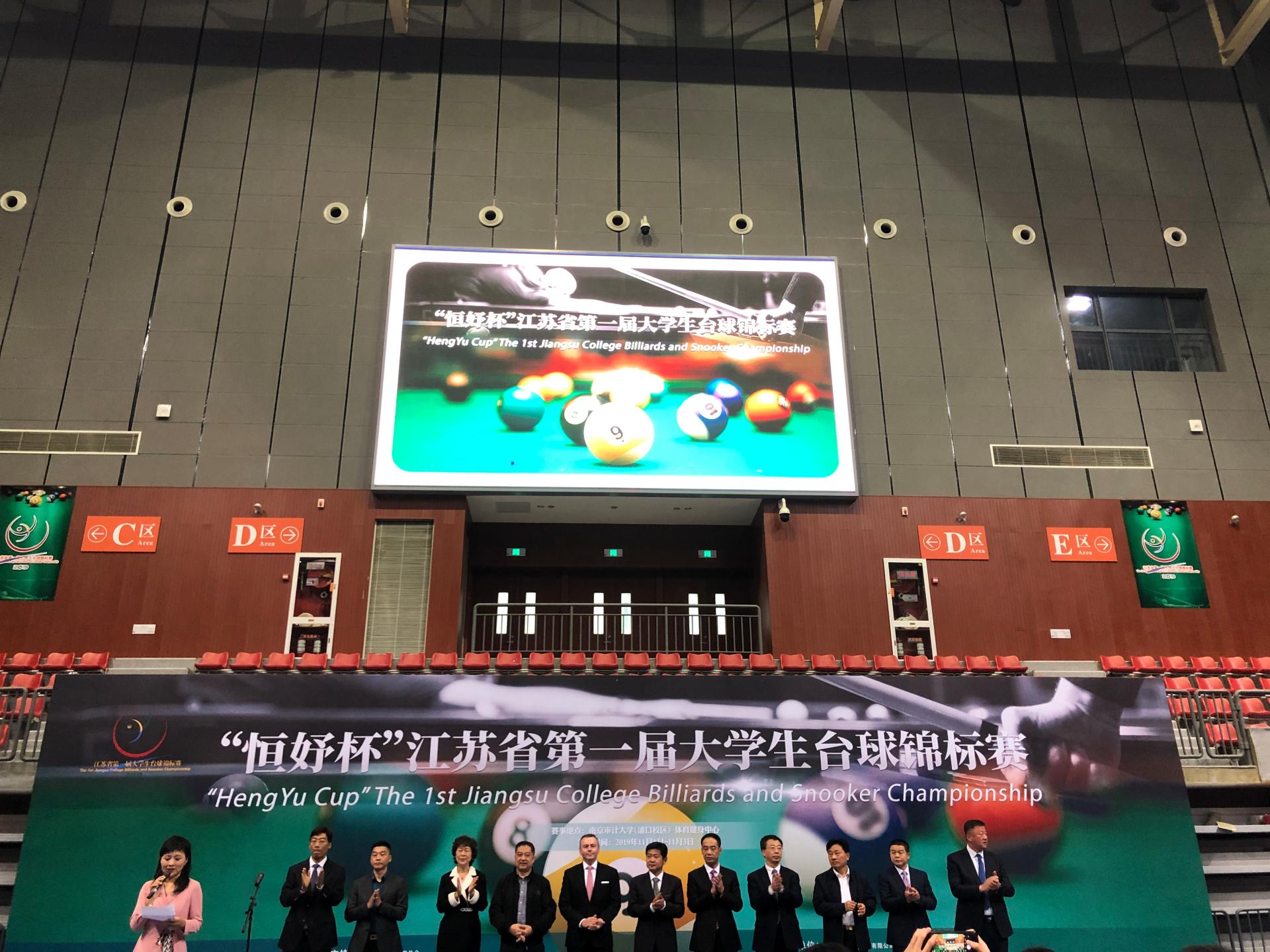 2019111-3日,由江苏省学生体协高校工作委员会、江苏省社会体育管理中心主办的“恒妤杯”江苏省第一届大学生台球锦标赛在南京审计大学举行,世界台联主席杰森•佛格森,中国台球协会秘书长刘春胜等参加了开幕式。