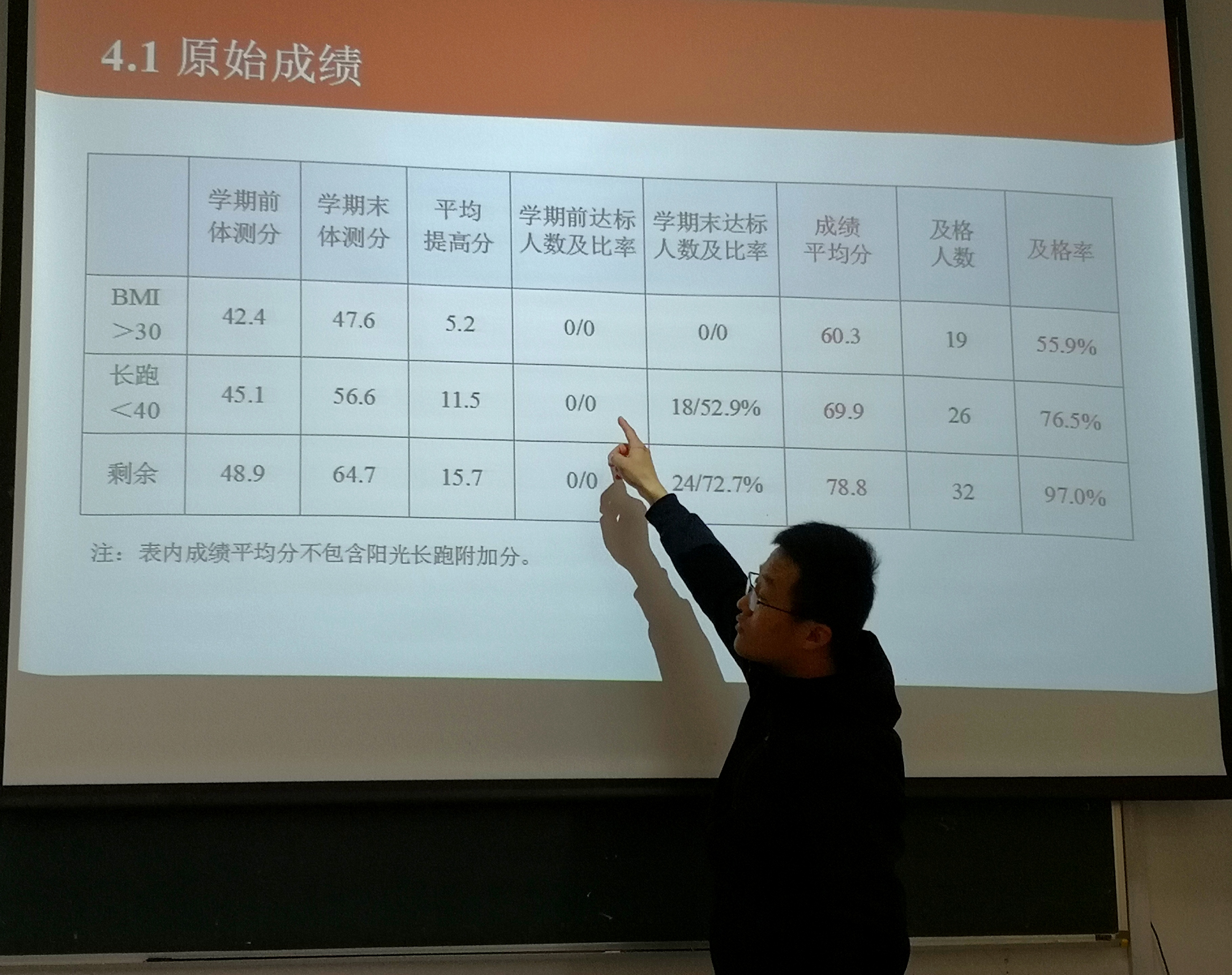 副主任陈晓霞老师开篇回顾了bv伟德国际1946体弱生体能强化班的发展概况,在总结以往教学经验基础上,针对体能强化班教学过程中存在的突出问题作出答疑和解决路径指引。程刚老师结合过去一年的教学实践,以PPT形式从体弱生筛选原则、强化班分班依据、教学时长安排、考核方式及成绩评定方法和注意事项等五个方面展开介绍,并系统分析了2017-2018学年体弱生体能强化班成绩,提出优化课程成绩评价标准的具体方案。颜耀春和胡琴老师分别就教学目标、教学内容、教学方法、负荷安排、负荷量度监控以及教学过程中的注意事项等方面教学经验进行了分享。会议最终修订了本学期体弱生体能强化班课程的具体实施方案。