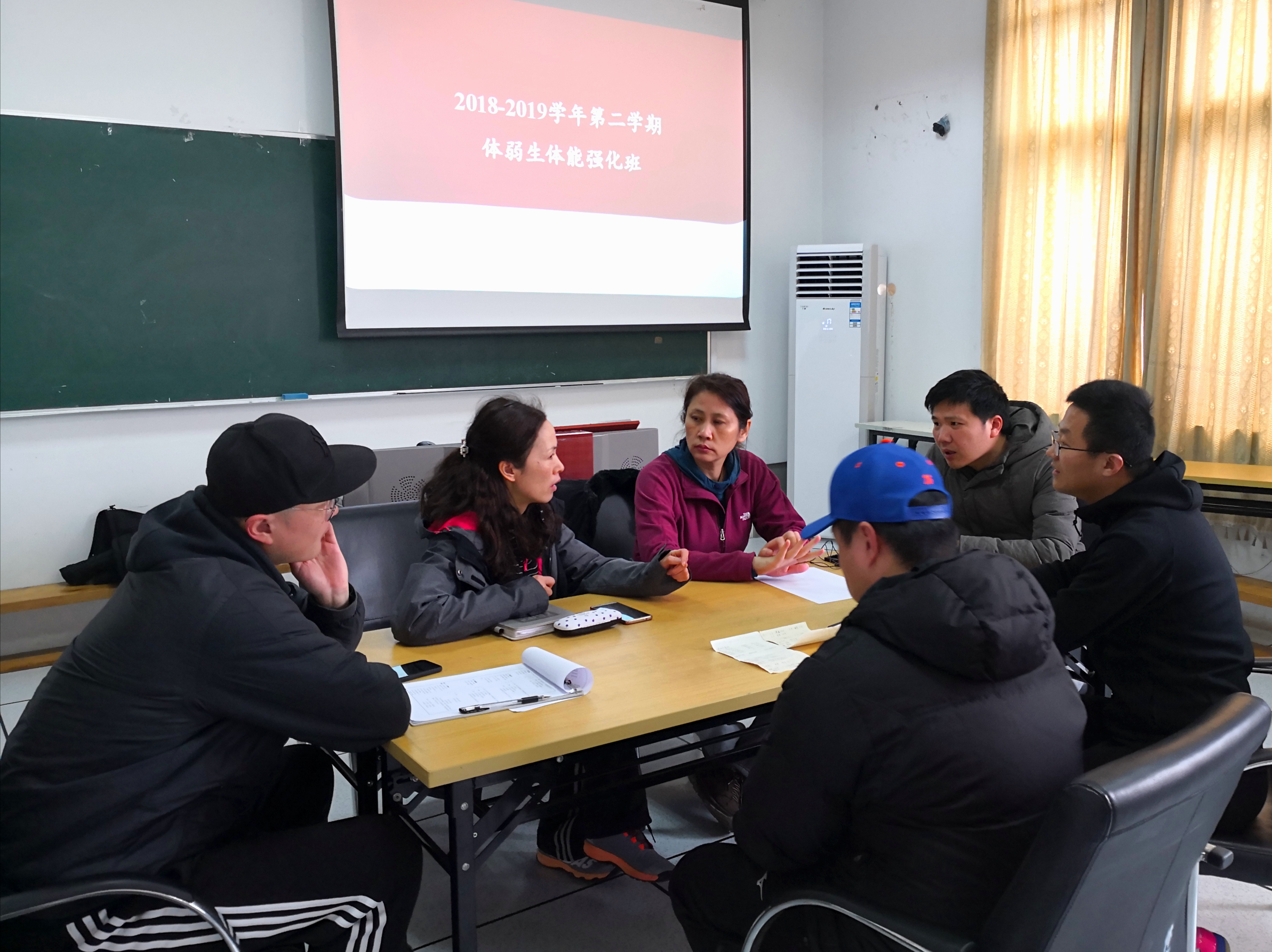 为全面强化bv伟德国际1946体育工作,进一步深化bv伟德国际1946体育改革,提高体弱生的体质健康水平,2019年3月1日(周五)中午12:30,体育部组织体弱生体能强化班教学团队成员在综合馆三楼会议室召开了 2018-2019学年第二学期体弱生体能强化班专题研讨会。体育部副主任陈晓霞、以及团队成员颜耀春、胡琴、孙景召、程刚、张继鹏和解涛瑞六位老师参加了会议。