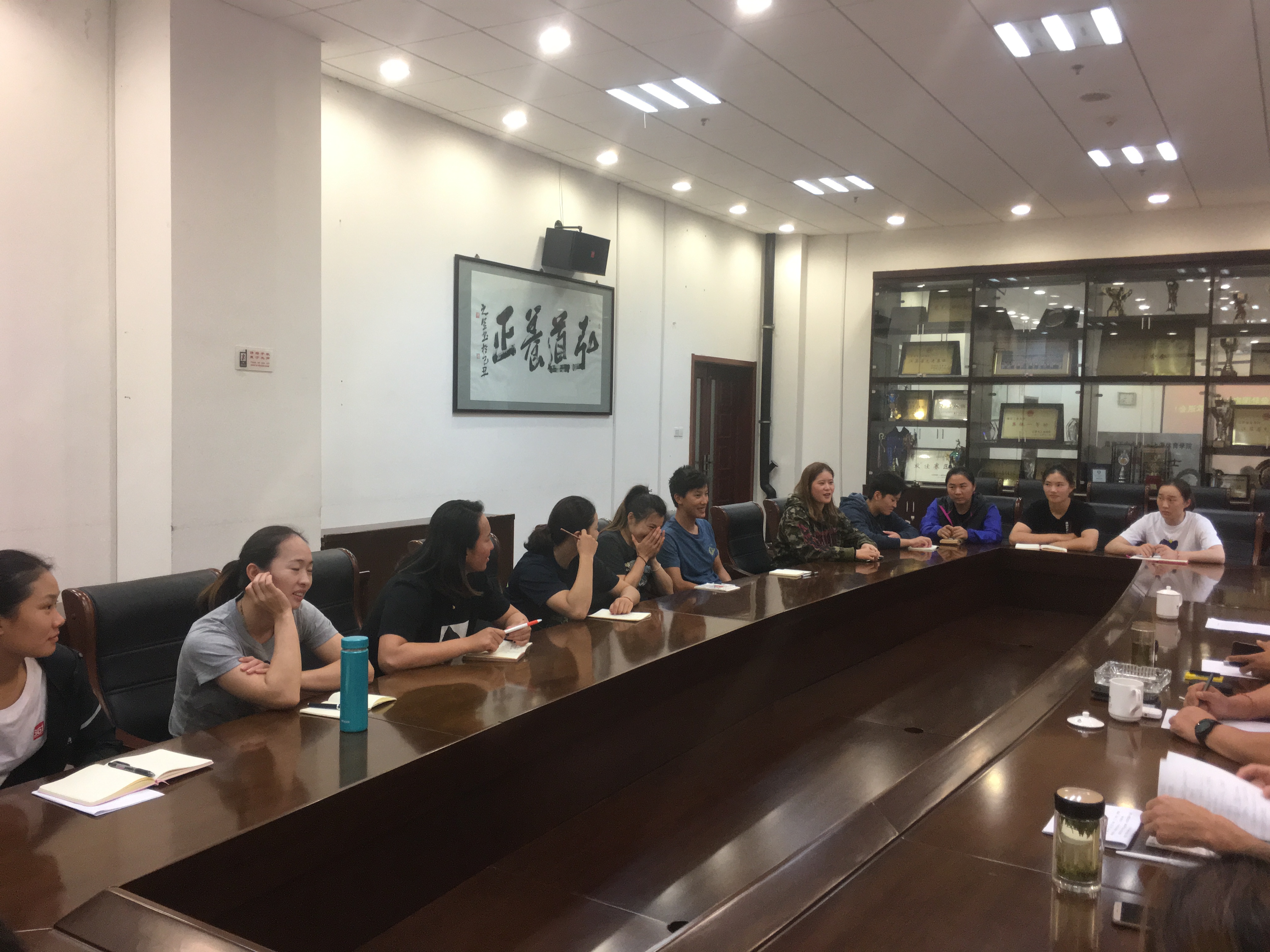 体育部主任张天峰教授队对此次赴美的国家队队员提出三点要求。一、要求我们女垒队员面对新的美国教练团队,对于此次集训自己要有新要求,迎接新的挑战,要尽快适应新环境,在训练和比赛中要勇于表现、善于沟通、脱颖而出。平时要多思考、多交流、要学会换位思考,日常空余时间多读书,多学习,不断充实自己。二、要继续弘扬江苏女垒的团队精神,在训练比赛中要有容错的精神、包容的心胸,相互鼓励,相互帮助,发挥集体的力量,形成凝聚力。三、要发挥体育人只想赢、不愿输的精神,克服自身的惰性和弱点,在比赛、训练、生活中中永不放弃、迎难而上、不做逃兵。