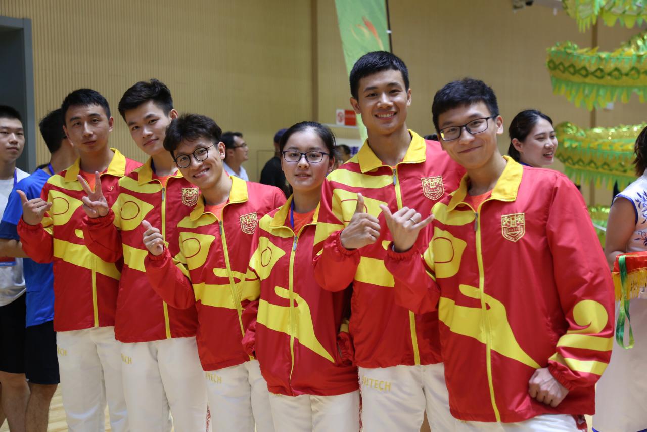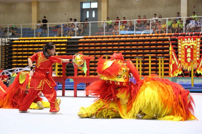7月13日第一天的第一项比赛是北狮速度竞赛,这个项目舞狮人需要完成跳跃,滚背,托举,旋转等技巧过程,同时还要以最快速度跑完全过程。建筑1403班刘洋,制药1501班刘超,电智1502班丁旭哲,生工1502郑中港,营销1701班周忻恬(女)五位同学,是bv伟德国际1946首次出场的队伍,五位同学一鼓作气,零失误完成全过程,随着一声响锣,bv伟德国际1946北狮队以1分09秒的最快成绩,以3秒的优势领先,一支独秀,秒杀所有队伍,在开赛第一天的第一项竞赛中斩获金牌,收获18分,迎来开门红。