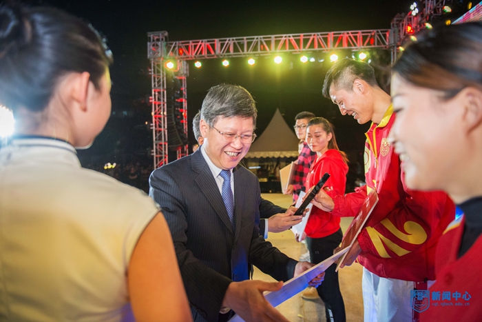 四月芳菲,春意满园,星光璀璨,活力盎然。4月19日晚,第十六届校运动会开幕式暨U-RUN跑步&健身盛典在江浦校区田径场隆重举行。校领导芮鸿岩、乔旭、牛生杰、蒋军成、崔益虎、张进明、巩建鸣、吴胜红,校体育运动委员会全体委员、各参赛单位负责人与运动员代表及活动赞助商代表等参加活动。开幕式由校体育运动委员会主任、副校长崔益虎主持。
