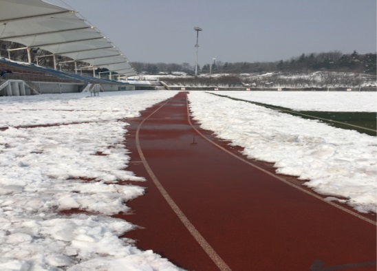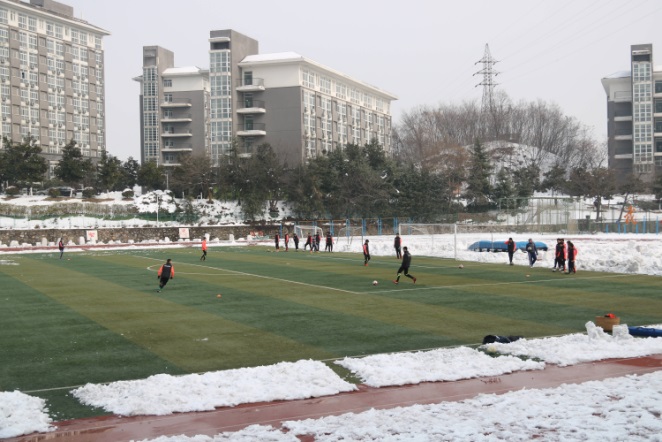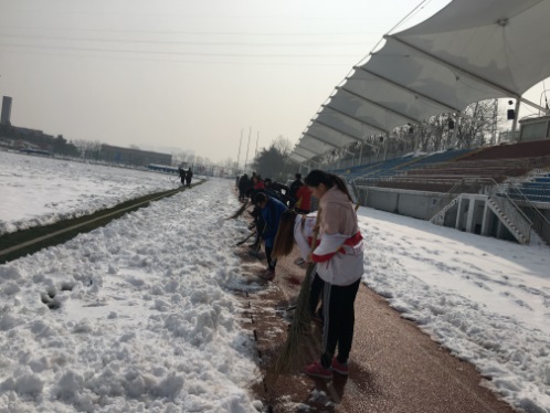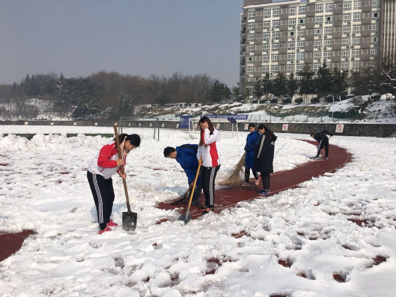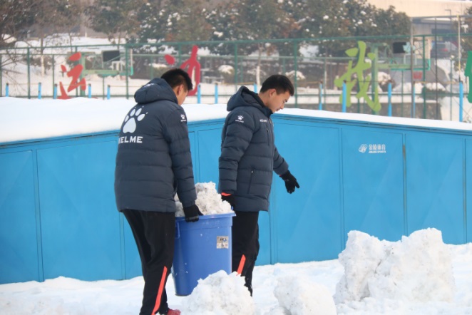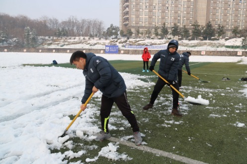 持续两天半的暴雪,浦江田径场已经被冰雪覆盖,寒冷的天气也为训练带来了不便。于是,在29日、30日两天的训练结束之后,田径队、足球队的队员们也自发地借助能用的工具,开始了田径场的除雪抗冻工作。