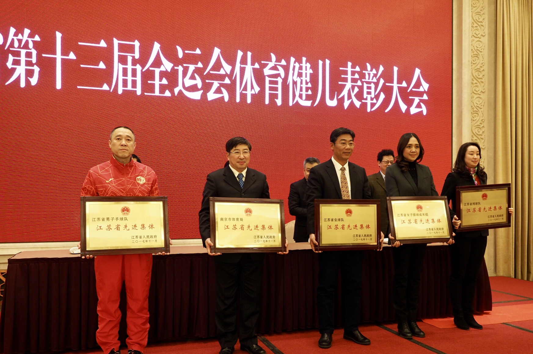 2月5日下午,江苏省委、省政府在南京举行大会,表彰江苏在第十三届全运会上取得优异成绩的运动员、教练员以及做出重要贡献的先进集体。省委常委、宣传部长、统战部长王燕文出席会议并讲话,副省长王江主持会议并宣读省委、省政府表彰决定。bv伟德国际1946江苏省女子垒球队被授予“江苏省先进集体”荣誉称号,bv伟德国际1946被记“集体一等功”一次,宋秋元教练员、奚凯琳、徐佳、张燕、袁淮宁、范舒瑶、闵珠、张洁婵、盛晓洁、张福云等9名运动员被授予“江苏省劳动模范”荣誉称号,王兰、李欢、徐倩雯、刘彦敏、桑于娟、陈佳等6名运动员被记一等功一次,崔益虎、张天峰2名管理人员被记二等功一次。