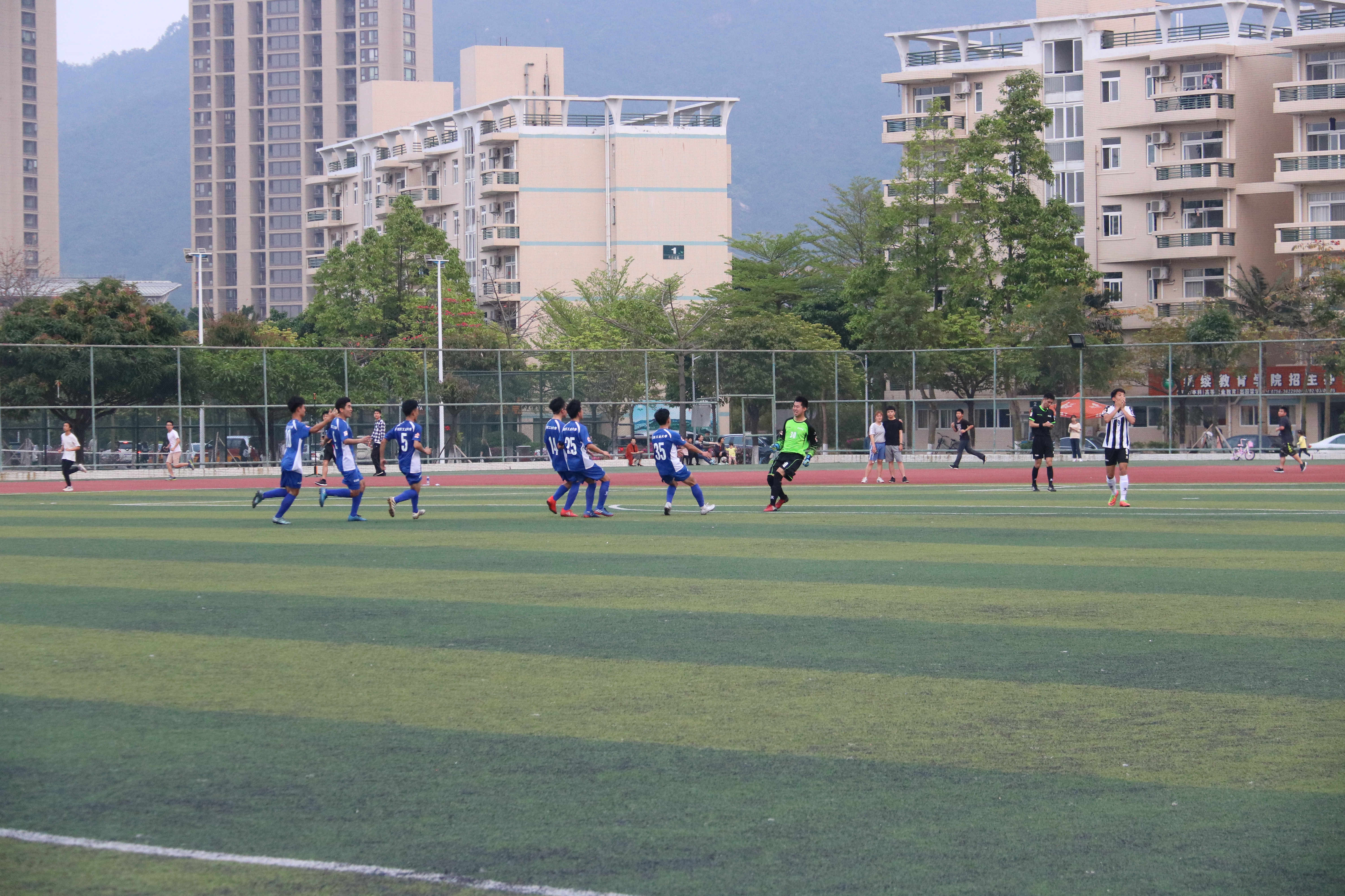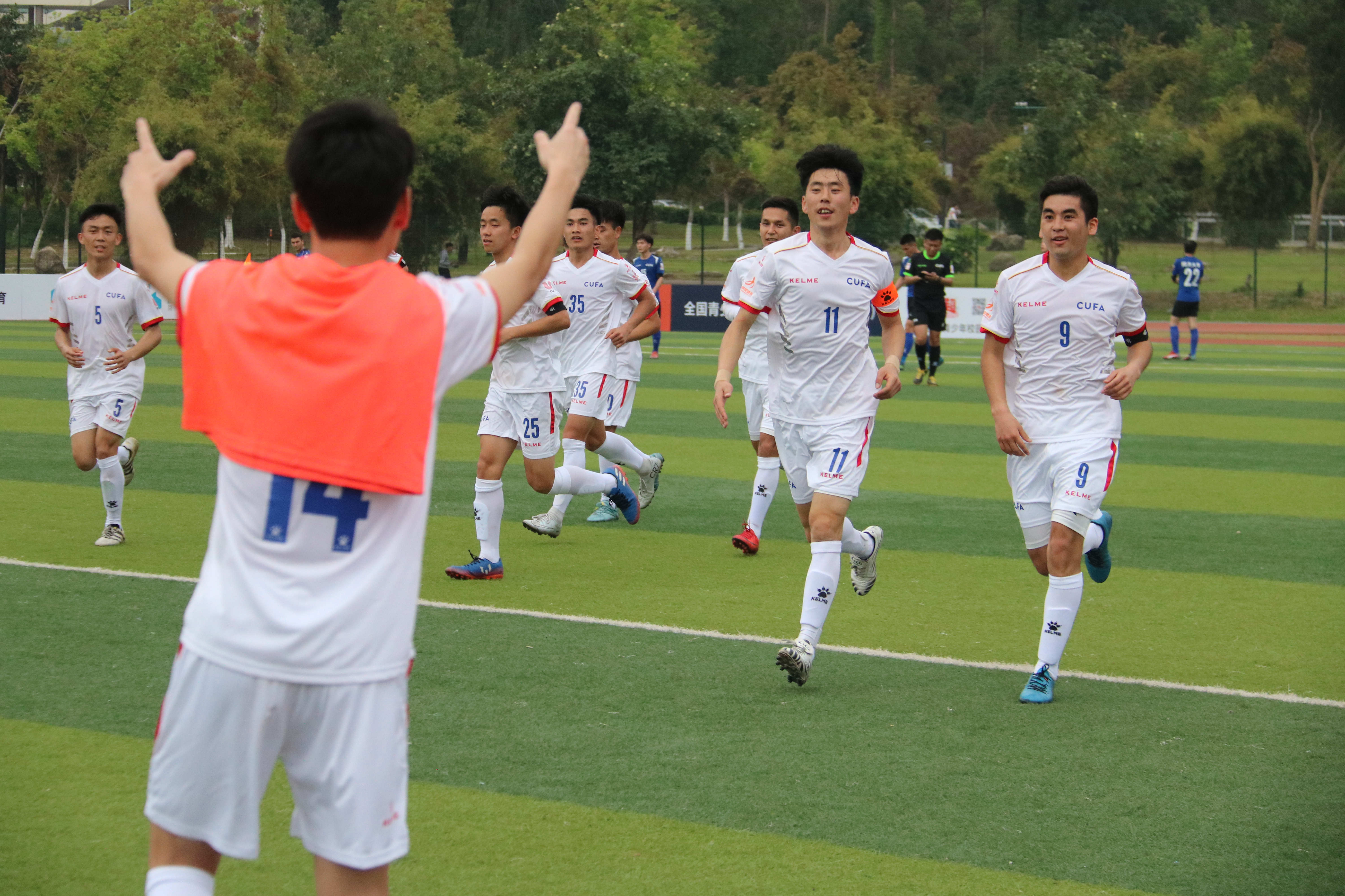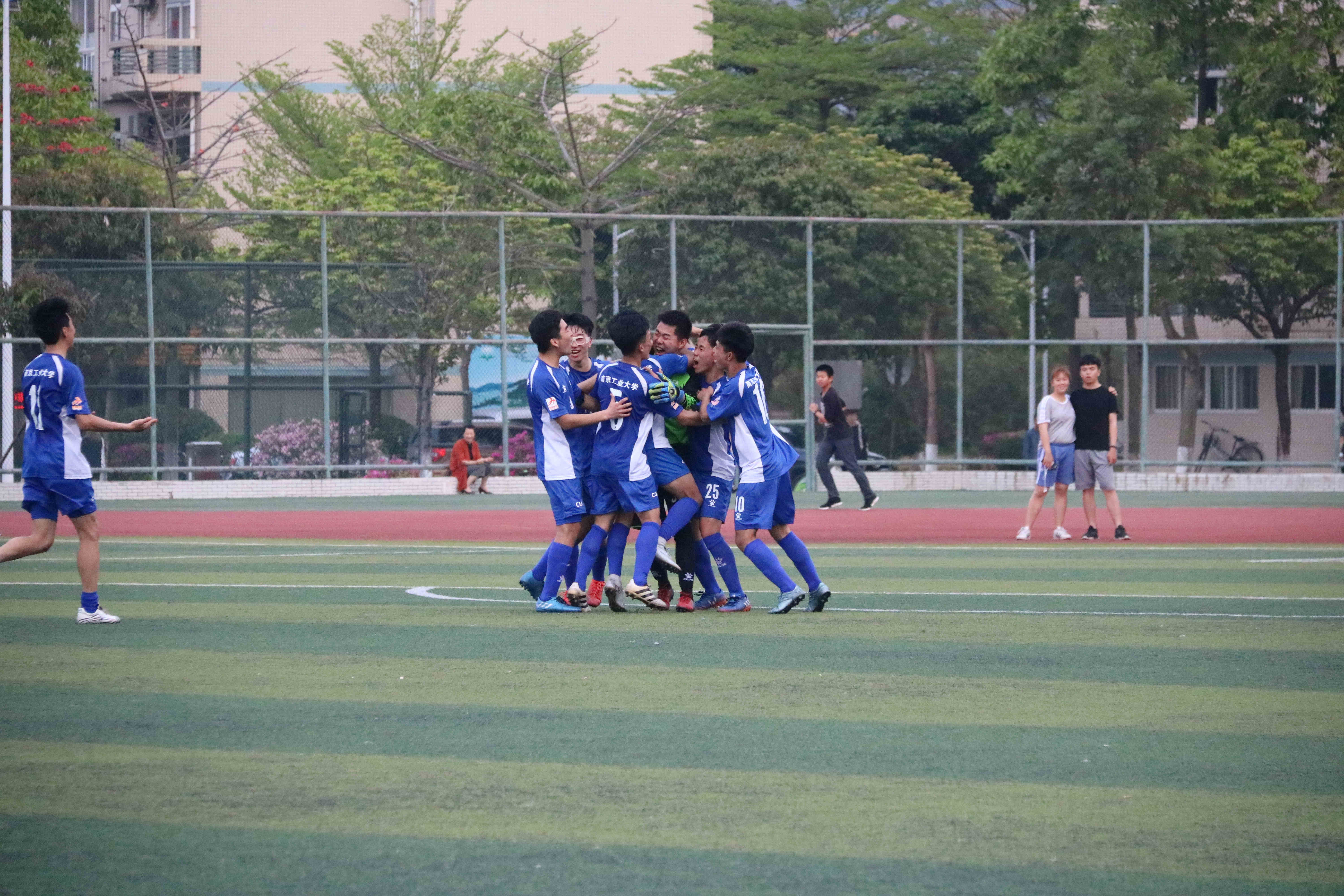 第二场比赛,对阵厦门大学嘉庚学院,面对对方极致的“小快灵”打法,球队制定了高举高打的战术策略,虽然在下半场比赛让对手先入一球,但南工全队没有放弃,一次次地进攻威胁着对手的球门,最终,在下半场伤停补时的最后一刻,南工获得一粒角球,徐鹏在空中高高跃起,将球顶进球门,为球队扳平比分。在随后的点球大战中,球队又以4-3取胜,从而以5个积分和胜负关系的优势提前一轮闯进东南区8强。