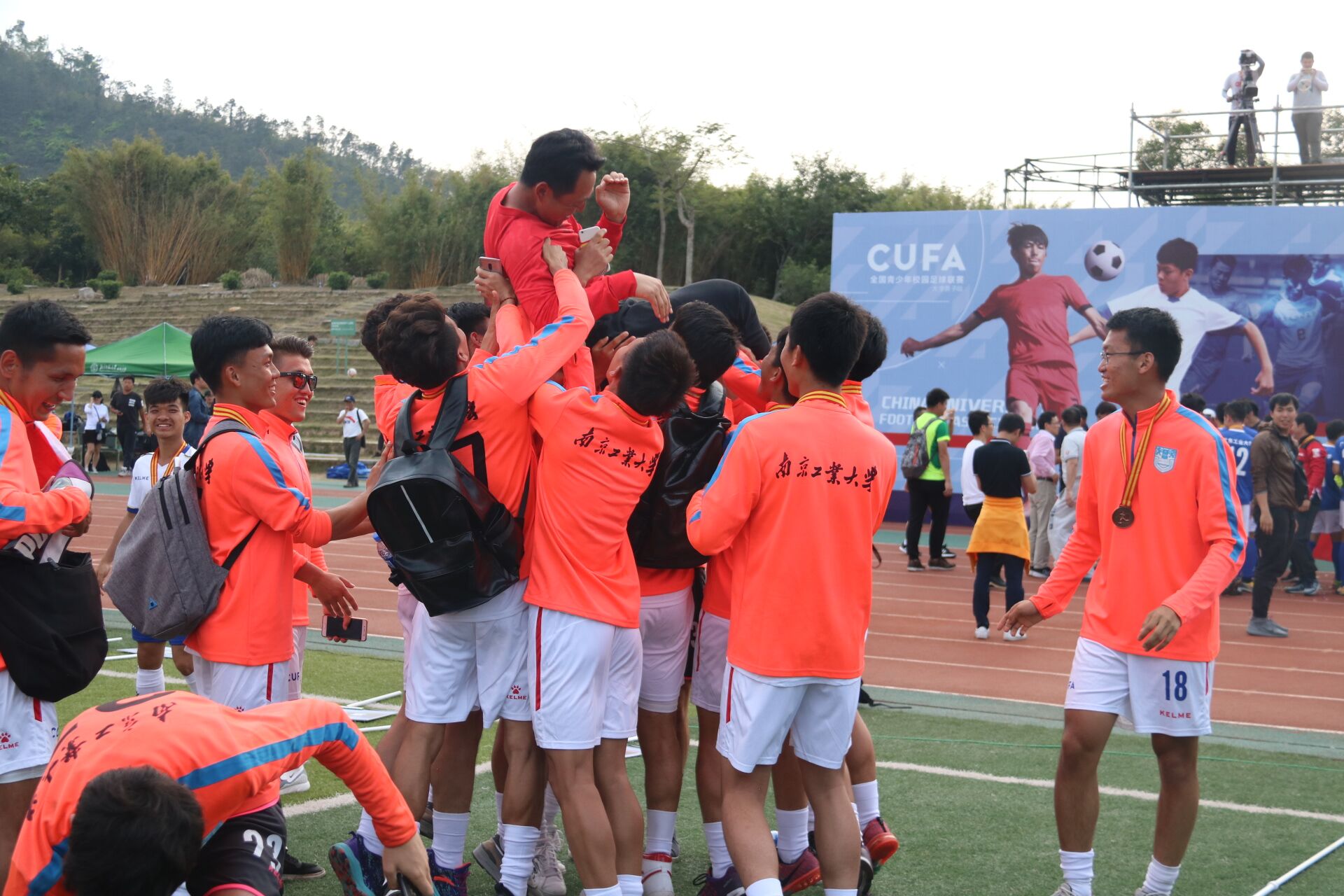 bv伟德国际1946普通生男子足球队自2008年组建以来,从无到有,从弱到强,他们在40度高温的酷暑天挥汗如雨,在大雪纷飞的严冬坚持训练,在赛场上以“南工战斗”的雄壮气魄披荆斩棘、顽强拼搏。期间经历了无数次失之交臂的遗憾,也见证了一次次奇迹,今天终于“修成正果”。我们相信,他们会在“沉着冷静、永不言弃”的球队精神感召下走得更远。