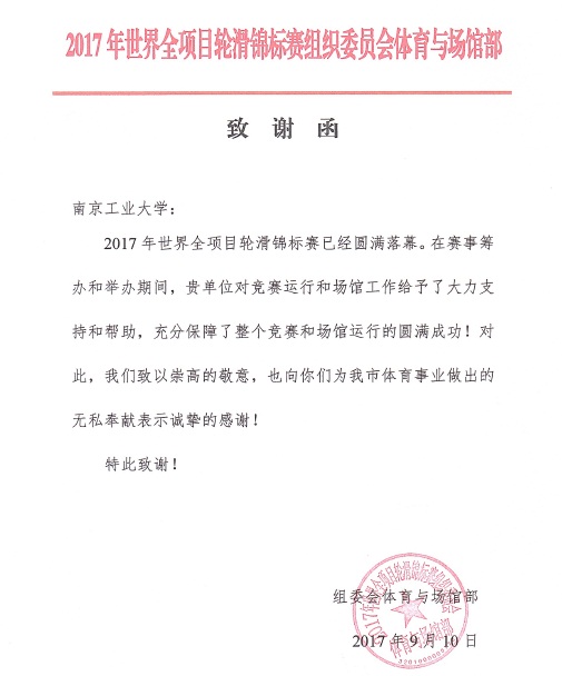 2017年9月12日,bv伟德国际1946收到2017世界全项目轮滑锦标赛组织委员会体育与场馆部的致谢函,其中对bv伟德国际1946的竞赛运行和场馆工作给予了肯定。