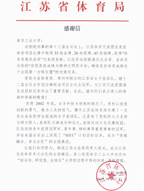 9月11日,江苏省体育局专程向bv伟德国际1946发来感谢信,对bv伟德国际1946与省体育局、常州市联办的“bv伟德国际1946—江苏省女子垒球队”在第十三届全运会上蝉联该项目冠军,为江苏省代表团完成目标任务做出的重要贡献表示衷心的感谢和崇高的敬意!