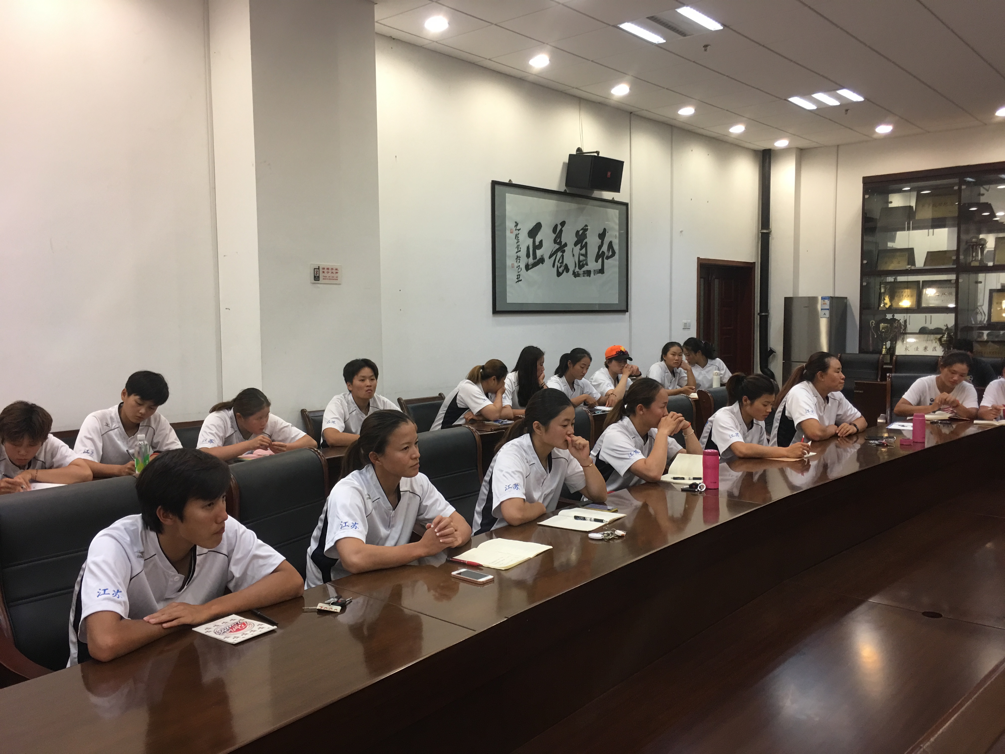 8月14日下午,欢迎南工江苏女垒队员代表国家队参加美国大联盟比赛归来座谈大会暨江苏女垒备战全运会动员会在bv伟德国际1946江浦校区体育馆会议室热烈召开。参加会议的有:bv伟德国际1946副校长崔益虎教授、江苏省体育局手曲棒垒中心主任严小平、bv伟德国际1946体育部主任张天峰教授、江苏省女垒主教练宋秋元、教练员黄维刚以及江苏女垒全体队员及相关人员。会议由bv伟德国际1946体育部主任张天峰教授主持。