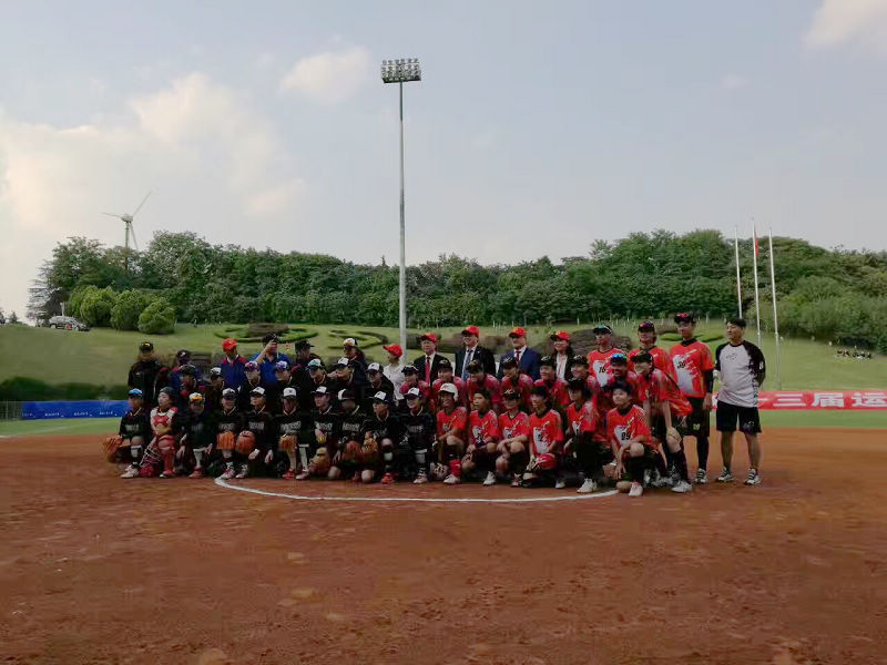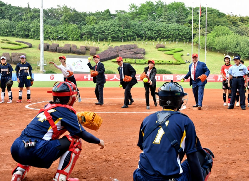 在开球仪式上,校大学生啦啦操队、龙狮俱乐部和街舞社团为观众呈现了精彩的现场表演,校国旗班举行了升国旗仪式。随后,国际棒垒球联合会主席Fraccari Riccardo、秘书长Benchoo Low、国家体育总局手曲棒垒球运动管理中心副主任谈莺、江苏省体育局局长陈刚、校党委书记芮鸿岩一同为江苏队—香港队比赛开球。