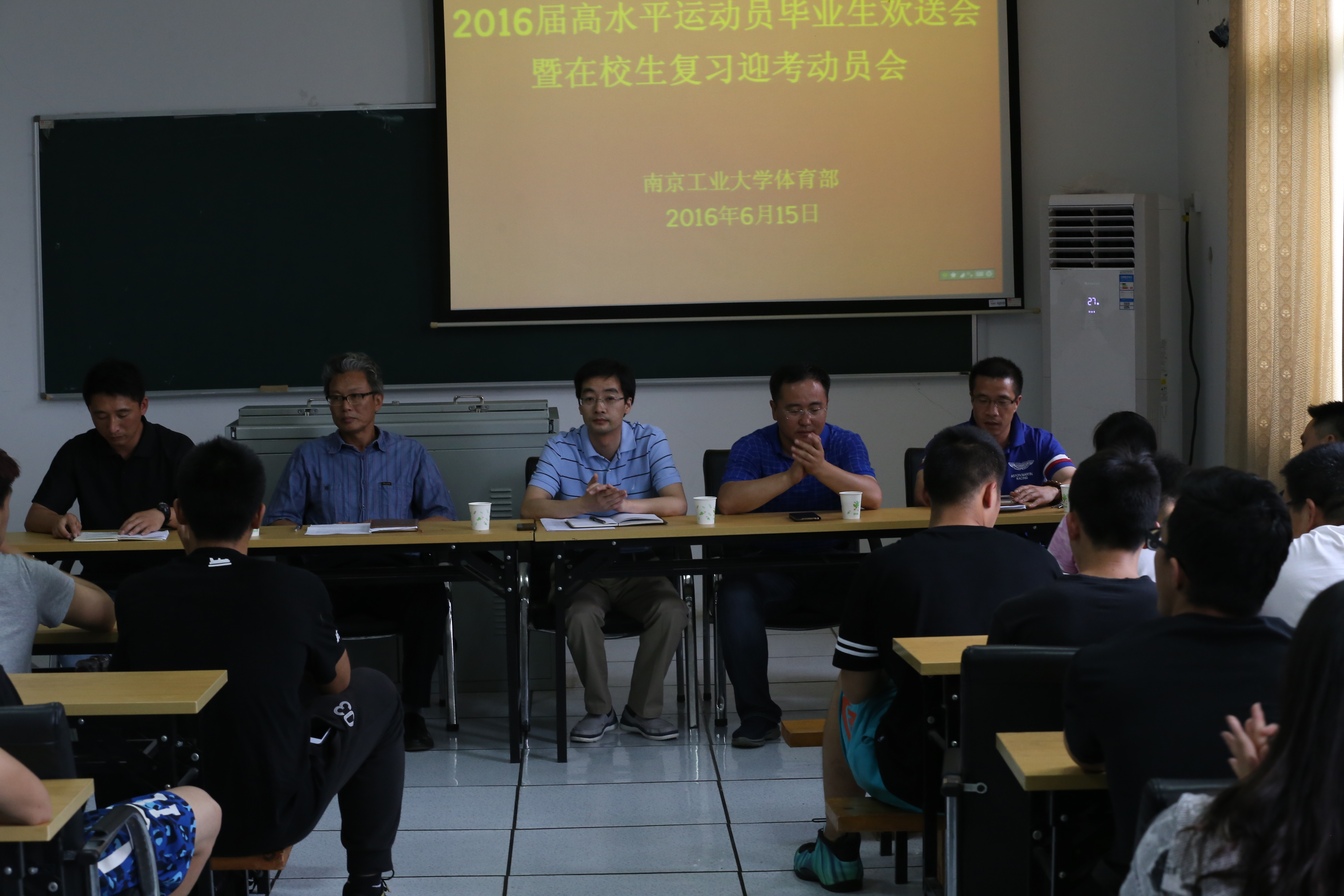6月15日下午,体育部在江浦综合馆三楼报告厅举行2016年高水平运动员毕业生欢送会暨在校生复习迎考动员会。体育部党总支书记方建强、副主任侯桂明、副主任孙欣荣、办公室主任陈军以及全体高水平运动队队员及教练员参加了会议。会议由运动队管理办公室主任於鹏主持。