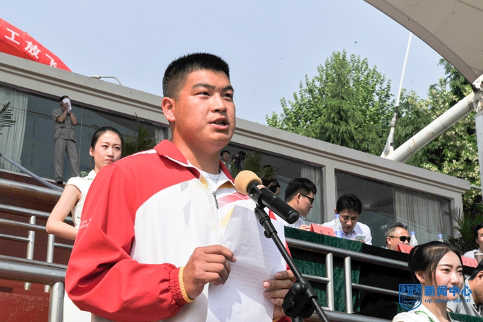 2015江苏田径锦标赛铁饼冠军、经济与管理学院孔景同学代表全体运动员宣誓。