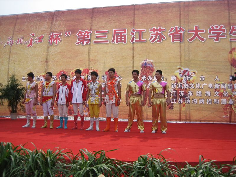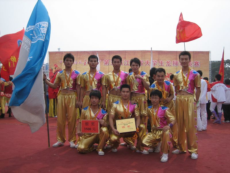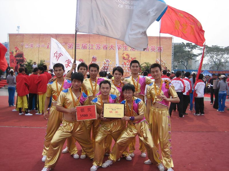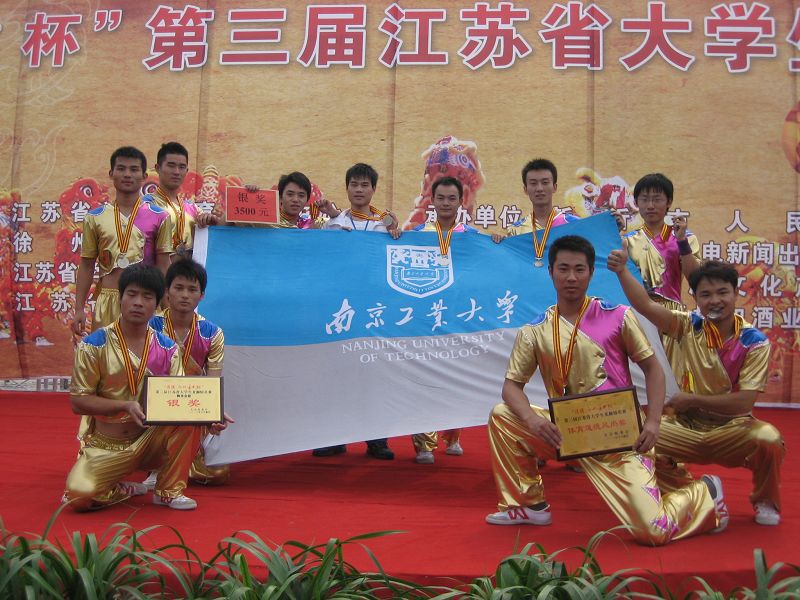 10月9日,由江苏省社会体育管理中心、徐州市体育局、江苏省学生体协高校工作委员会、江苏省龙狮协会主办,新沂市人民政府承办的“汤沟·两相和”杯第三届江苏省大学生龙狮精英赛在新沂市举行。本次比赛代表了江苏省龙狮比赛的最高水平,云集了来自南京理工大学、晓庄师范学院、南京林业大学等省内12所高校的17支大学生舞龙、舞狮代表队。在接到比赛任务后,杜寿高和王鸣骏两位教练员与队员们一起放弃了中秋、国庆以及周末等节假日时间开始训练。在训练中坚持高标准、严要求进行科学训练。在比赛中,校舞龙队在领队佘海文老师和教练员杜寿高老师带领下,队员们发扬顽强拼搏精神,克服种种困难夺得舞龙全能银奖和舞狮规定套路第四名的好成绩,并获得“体育道德风尚奖”称号,是历次参加该类比赛最好成绩。(来自于体育部)