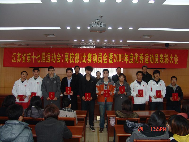 3月24日下午,体育部在江浦校区图书馆五楼会议室召开了参加江苏省第十七届(高校部)学生运动会动员暨2009年度优秀运动员表彰大会,各运动队的全体队员和教练员,体育部党政领导出席了本次动员暨表彰大会。会议由体育部副主任张天峰同志主持。