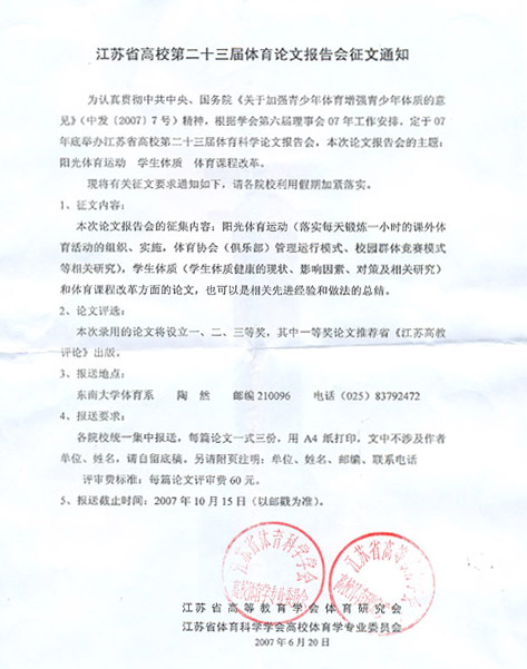 江苏省高校第二十三届体育论文报告会征文通知